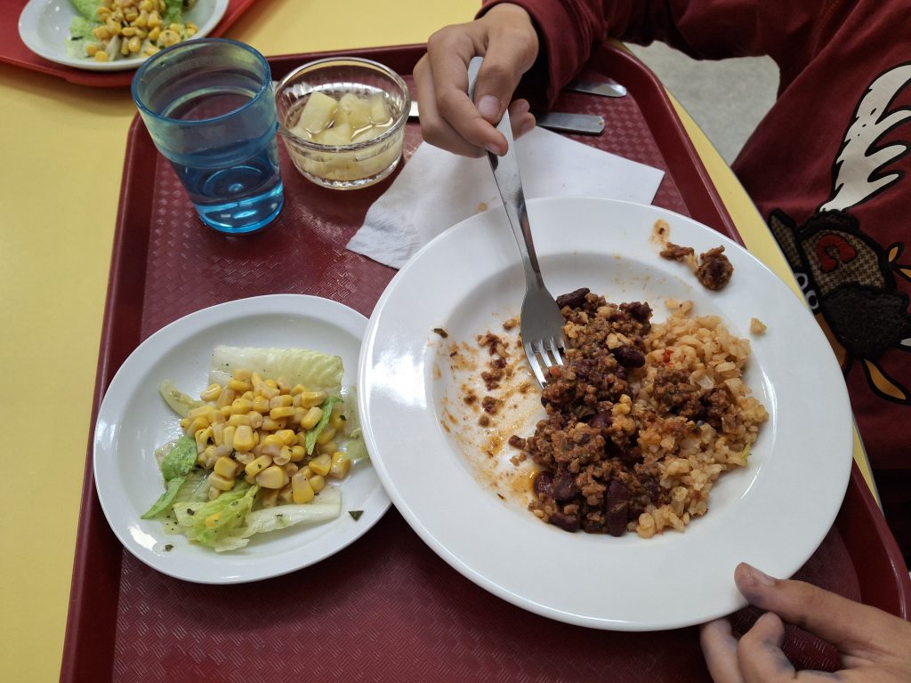 Ainsi, les enfants ont pu déguster des plats goûteux comme le Chili con carne (Mexique), Fish’n Chips (Royaume Uni) ou encore le Taboulé bio et couscous marocains. L’Italie était à l’honneur avec un repas alternatif végétarien (lasagnes aux légumes) et la France avec une salade de gésiers et la traditionnelle saucisse – lentilles.