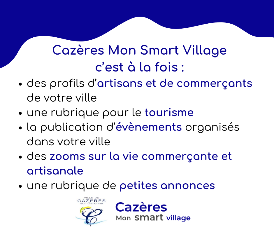Après une première campagne de recensement des commerçants et autres professionnels de Cazères réalisée par Docteur Conso, la municipalité de Cazères informe les citoyens de la mise en ligne de l’application Cazères Mon Smart Village.