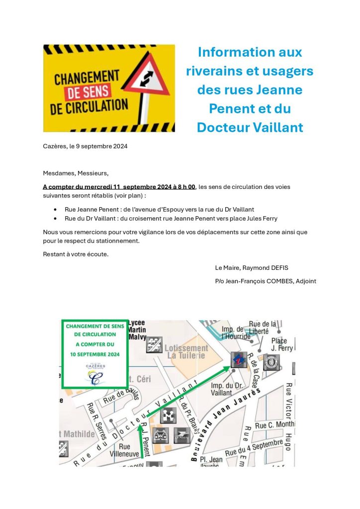 Changement de sens de circulation rues Jeanne Penent et Docteur Vaillant