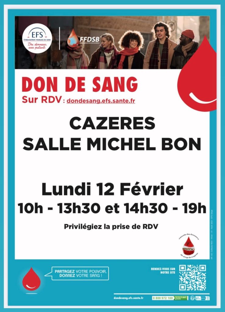 Le lundi 12 février 2024 est organisé un don de sang à la salle Michel BON de Cazères sur Garonne.