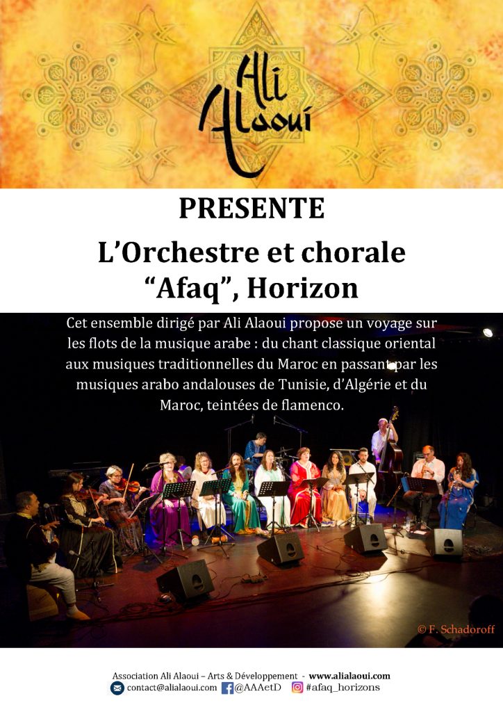 • 20h30 : Concert avec l’association AAA&D. Cet ensemble propose un voyage sur les flots de la musique arabe : du chant classique oriental aux musiques traditionnelles du Maroc en passant par les musiques arabo-andalouses de Tunisie, d’Algérie et du Maroc, teintées de flamenco.