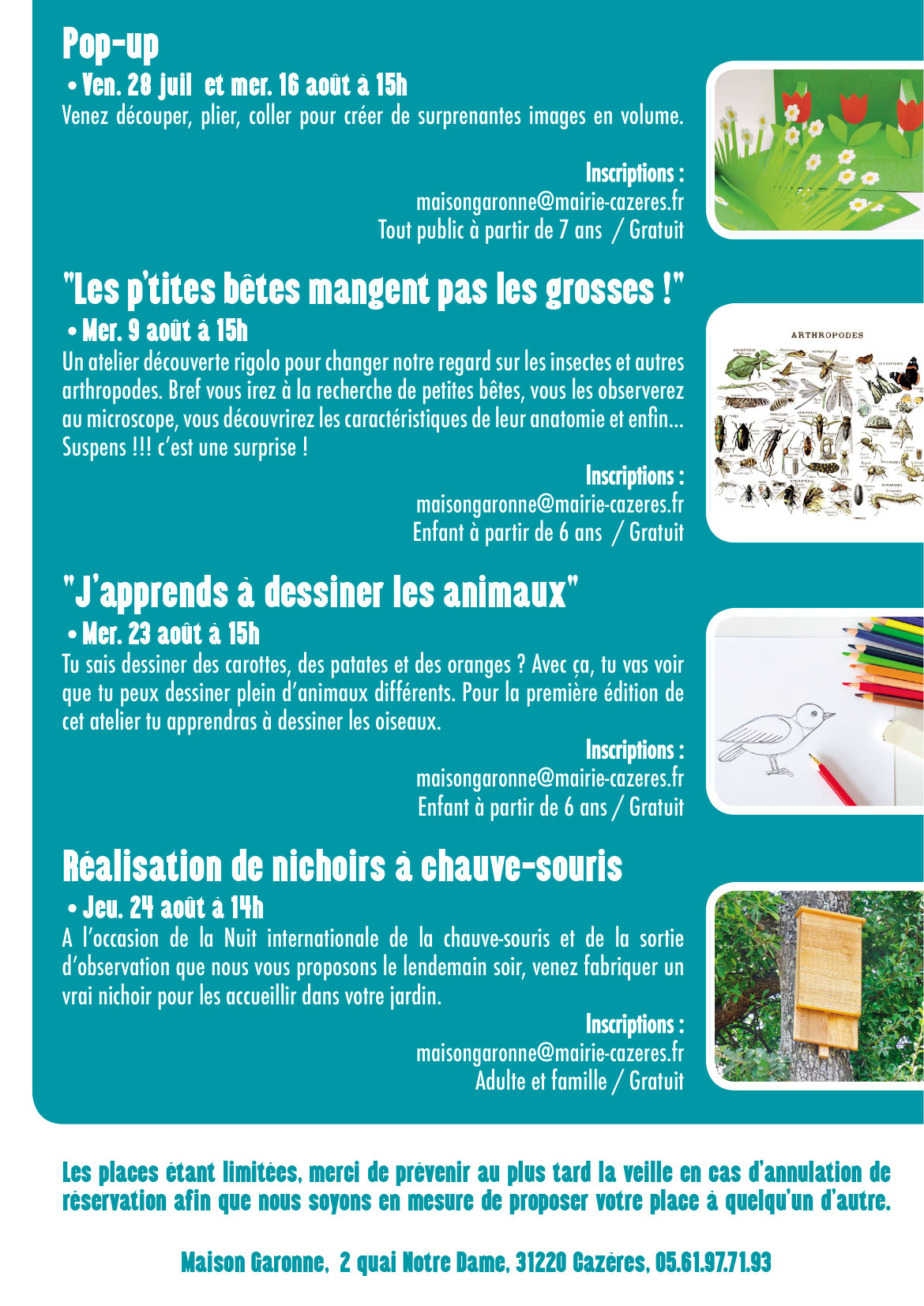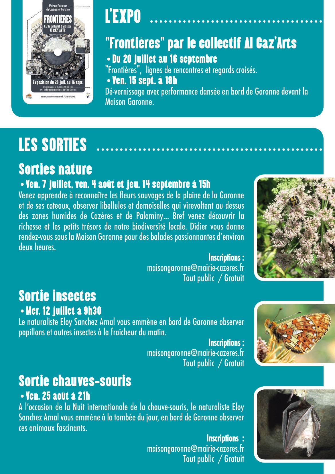 Venez apprendre à reconnaître les fleurs sauvages de la plaine de la Garonne et de ses coteaux, ou observer libellules et demoiselles qui virevoltent au dessus des zones humides de Cazères et de Palaminy… Bref venez découvrir la richesse et des petits trésors de notre biodiversité locale. Didier vous donne rendez-vous une fois par mois à 15h sous la Maison Garonne pour un balade passionnante d’environ deux heures.