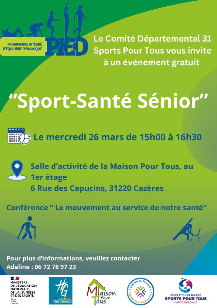 Pour commencer, vous êtes invités à vous rendre à la salle d’activité de la Maison Pour Tous (au 1er étage) à 15h le 26 mars pour la conférence : Sensibilisation aux bienfaits du sport sur la santé : « Le sport : un médicament sans effet secondaire » ;