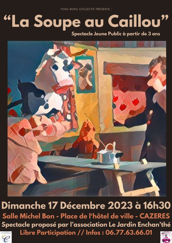 Dans le cadre d’un dimanche à Cazères, l’association le Jardin Enchan’thé propose, le Dimanche 17 décembre 2023 à 16h30 un spectacle pour enfants.