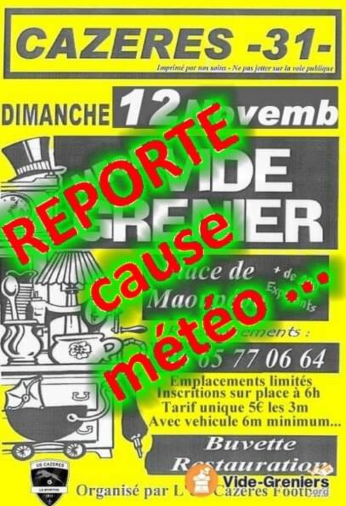 Dimanche 12 novembre 2023, se tiendra place de Maoupéou un méga vide-grenier, organisé par l’US Cazères Football !