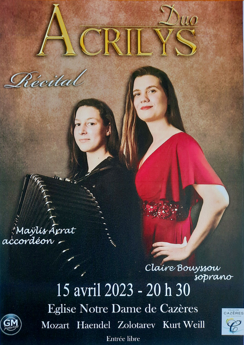 Samedi 15 Avr. 2023 Récital Duo Acrilys À partir de 20h30 Le 15/04/2023 Entrée libre Eglise Notre Dame