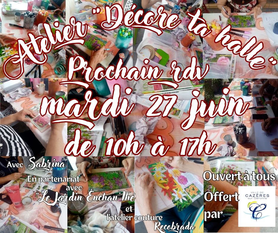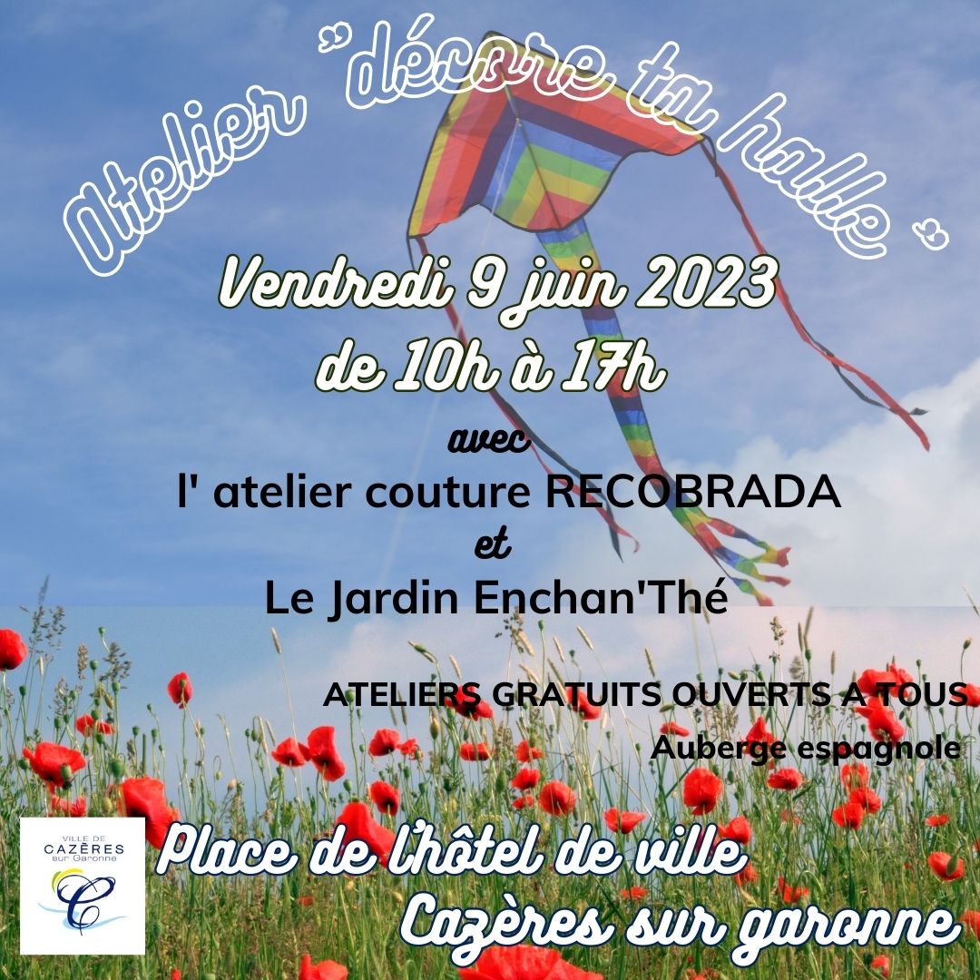 Mardi 27 Juin 2023 Atelier « Décore ta halle » De 10h à 17h Le 27/06/2023 Offert par la Mairie de Cazères Sous la halle Ouvert à tous