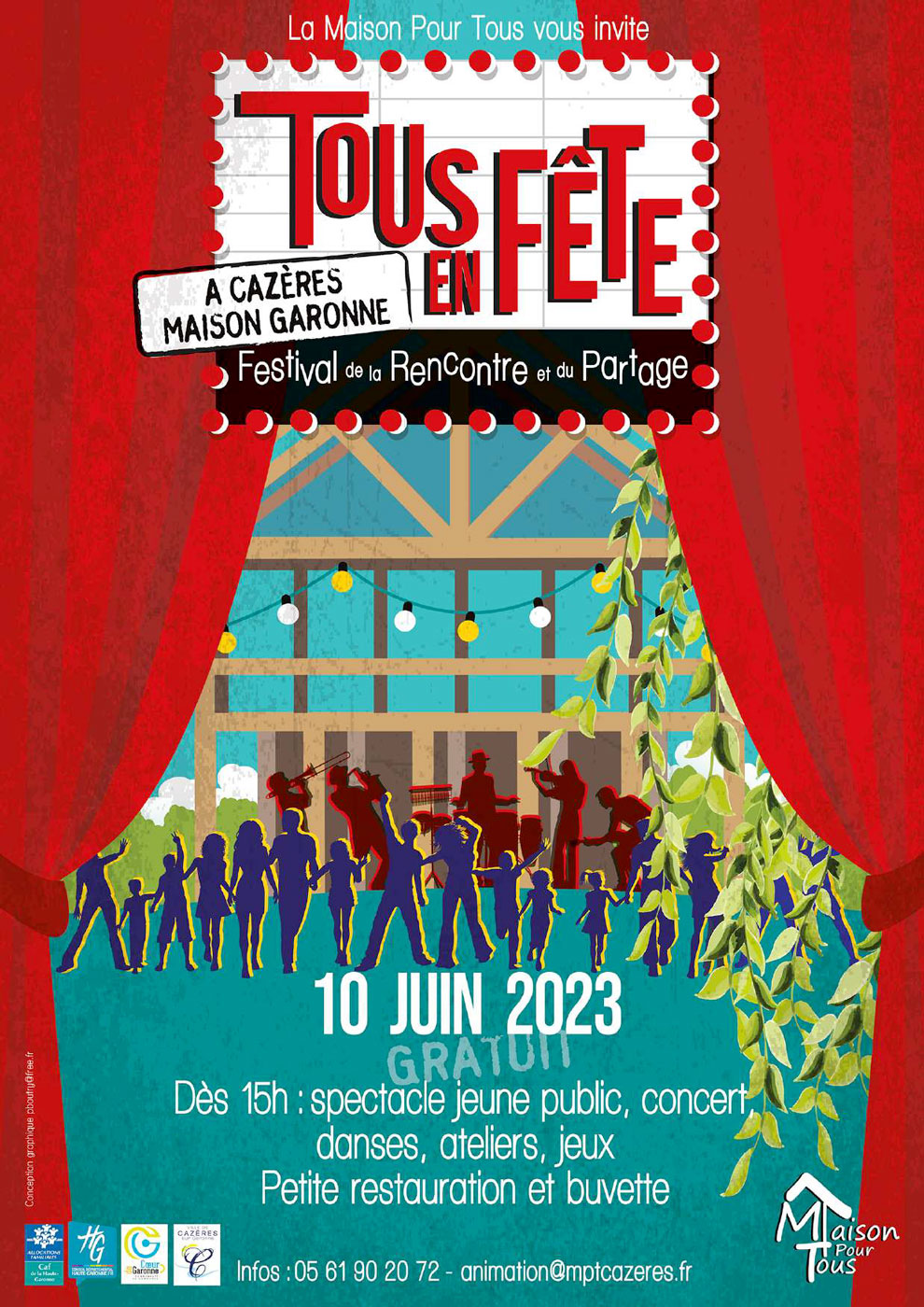 Samedi 10 Juin 2023 Tous en fête À partir de Dès 15h Le 10/06/2023 Gratuit Maison Garonne Spectacle jeune public, concert, danses, ateliers, jeux, petite restauration et buvette