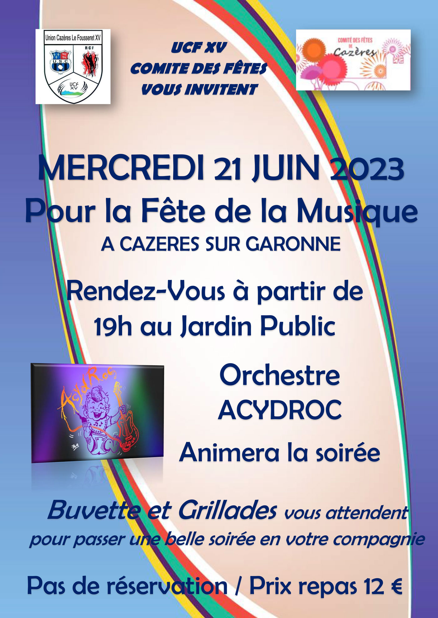 Mercredi 21 Juin 2023 Soirée Fête de la Musique À partir de 19h Le 21/06/2023 Pas de réservation / Prix du repas : 12 € Jardin Public Buvette et Grillades