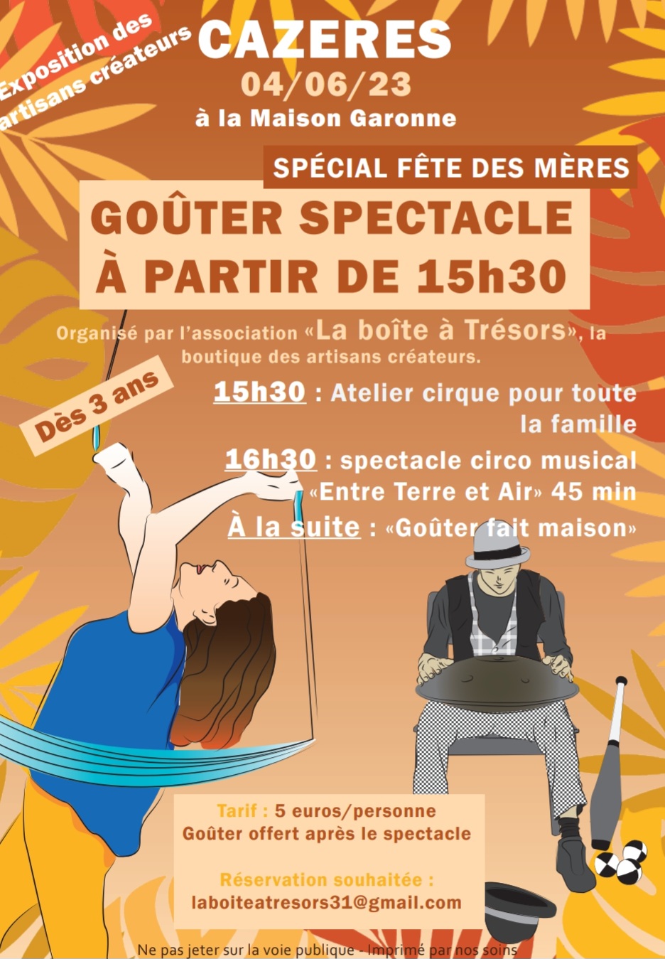 Dimanche 04 Juin 2023 Goûter spectacle spécial Fête des Mères À partir de à partir de 15h30 Le 04/06/2023 5 € par personne / goûter offert après le spectacle Maison Garonne Réservation souhaitée : laboiteatresors31@gmail.com
