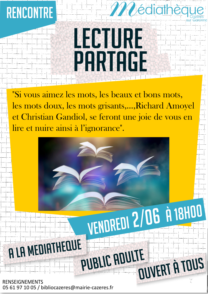 Vendredi 02 Juin 2023 Rencontre lecture partage À partir de 18h Le 02/06/2023 Médiathèque Public Adulte