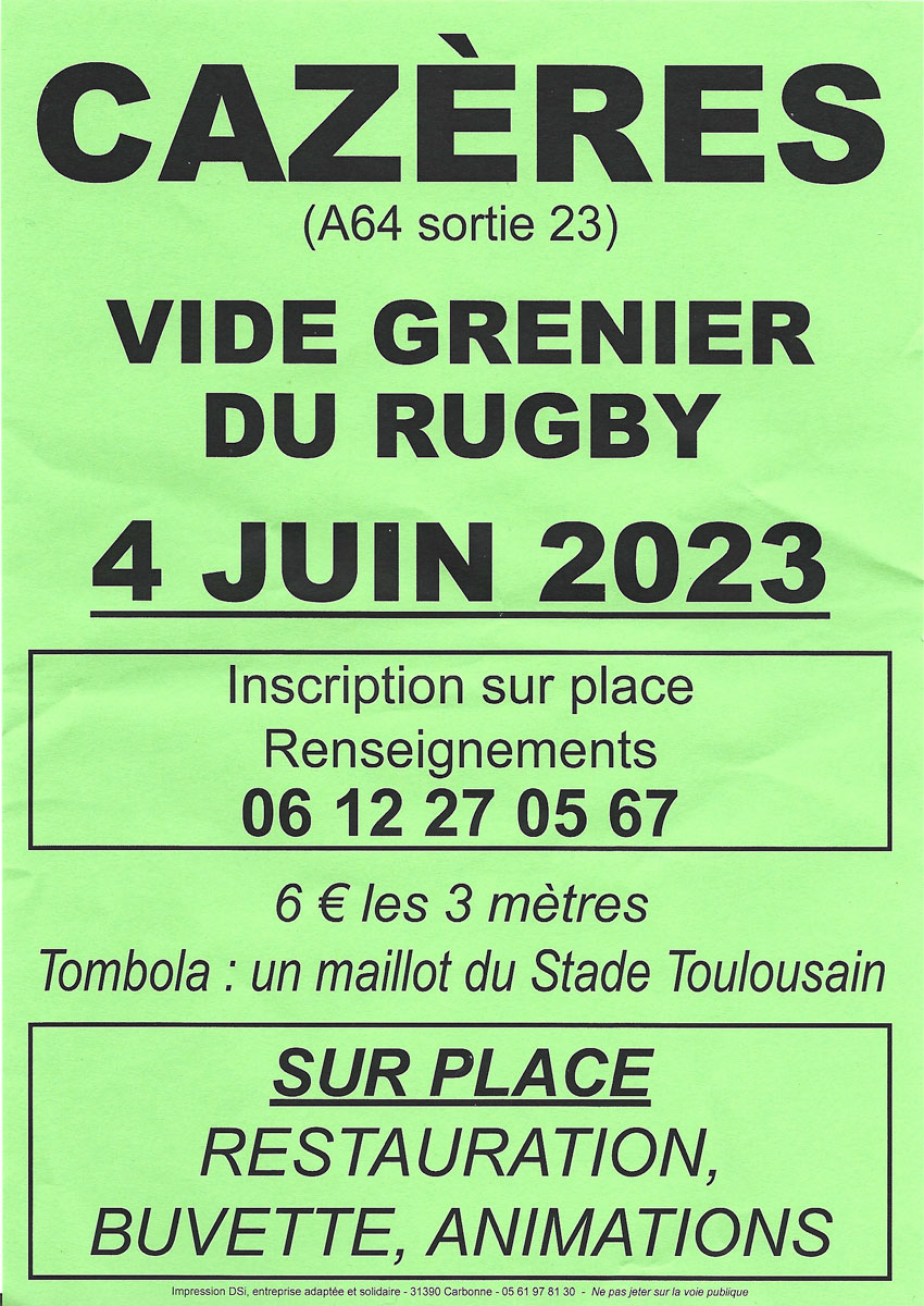 Dimanche 04 Juin 2023 Vide-grenier du rugby Le 04/06/2023 Tarif unique : 6€ les 3 mètres Place de Maoupéou Tombola avec un maillot du Stade Toulousain à gagner !