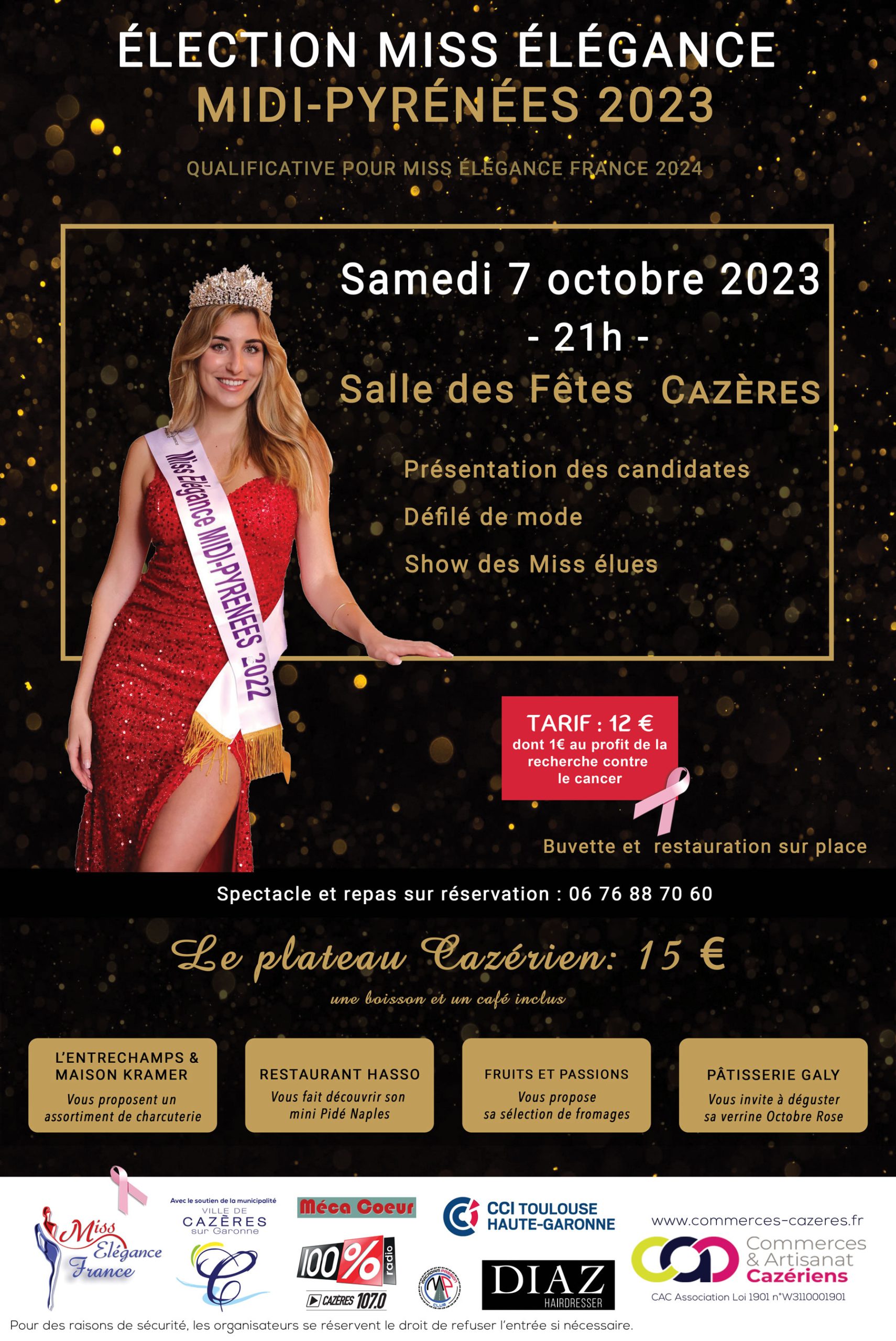 Samedi 07 Oct. 2023 Miss Elégance 2023 À partir de 21h Le 07/10/2023 12 € / Repas : 15 € Salle des Fêtes Sur réservation