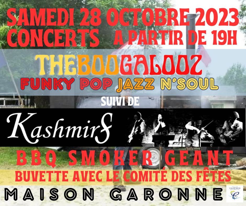 Samedi 28 Oct. 2023 Double concert gratuit À partir de 19h Le 28/10/2023 Gratuit Maison Garonne Buvette, restauration, BBQ smoker Géant.