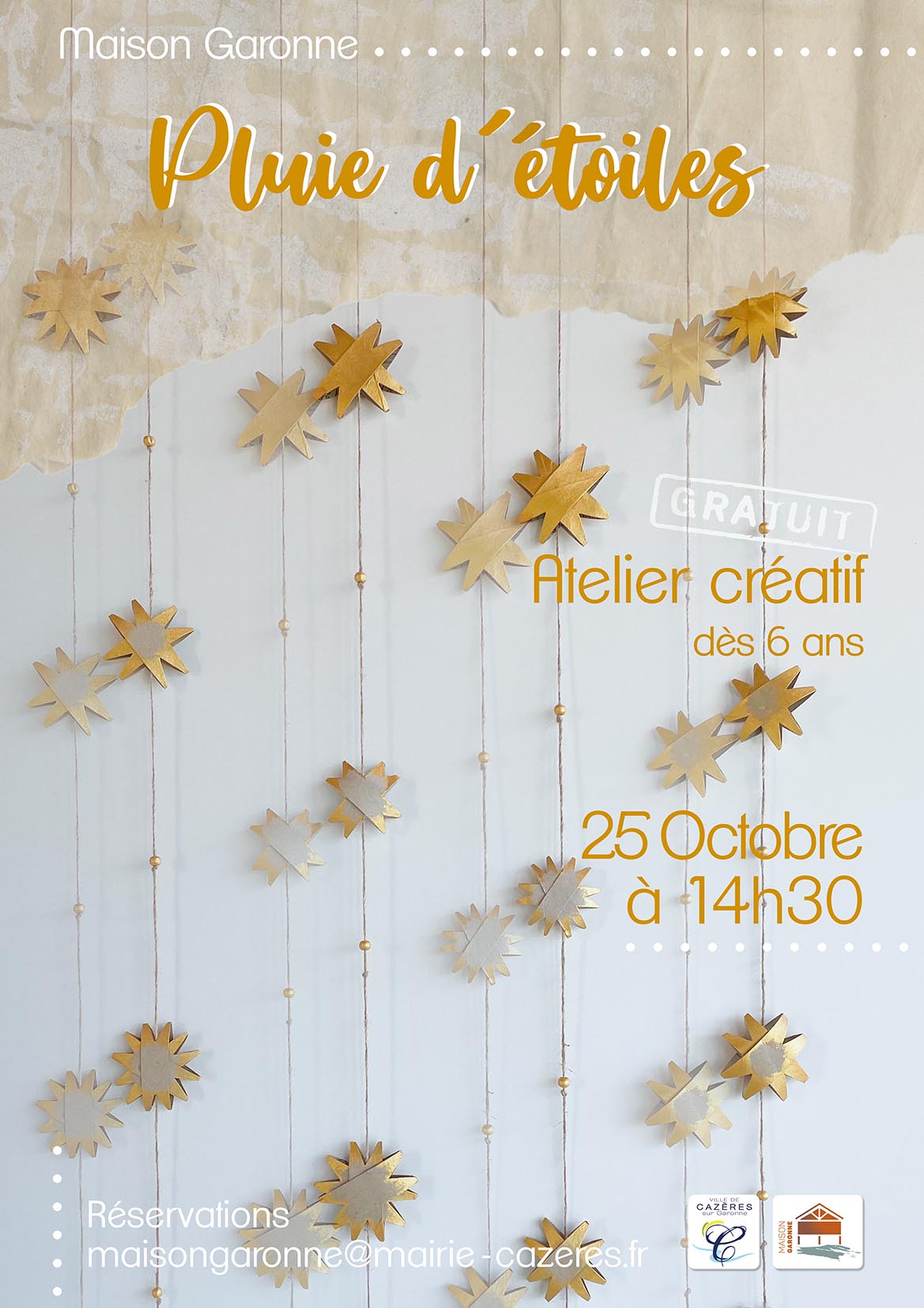 Mercredi 25 Oct. 2023 Pluie d’étoiles À partir de 14h30 Le 25/10/2023 Gratuit Maison Garonne Dès 6 ans