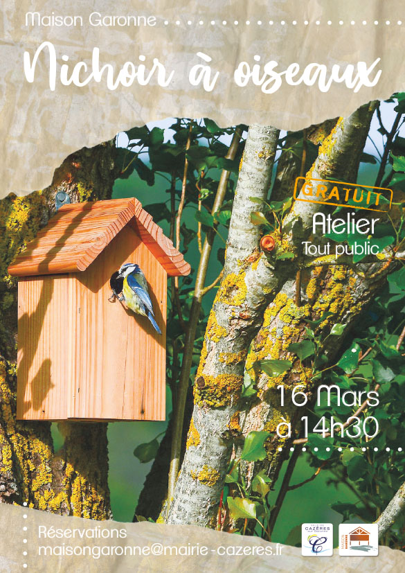 Samedi 16 Mar. 2024 Atelier nichoirs à oiseaux À partir de 14 h 30 Le 16/03/2024 gratuit Maison Garonne