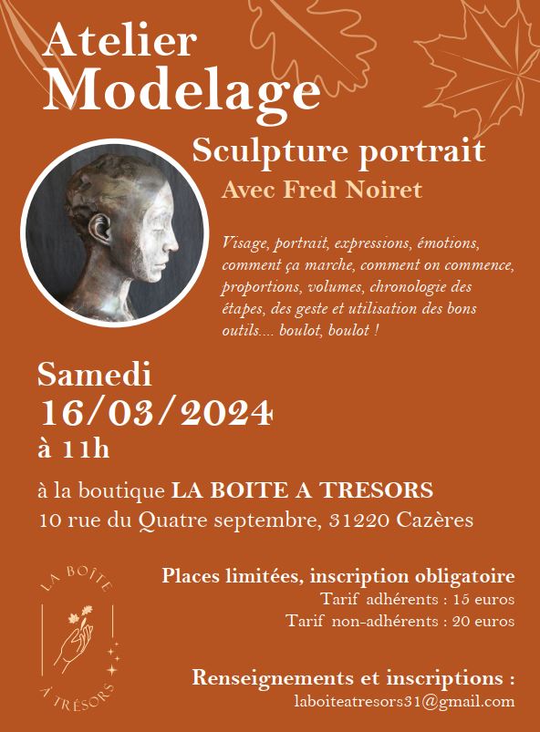 Samedi 16 Mar. 2024 Atelier Modelage À partir de 11 h Le 16/03/2024 tarif adhérents : 15 € / non adhérents : 20 € inscription obligatoire
