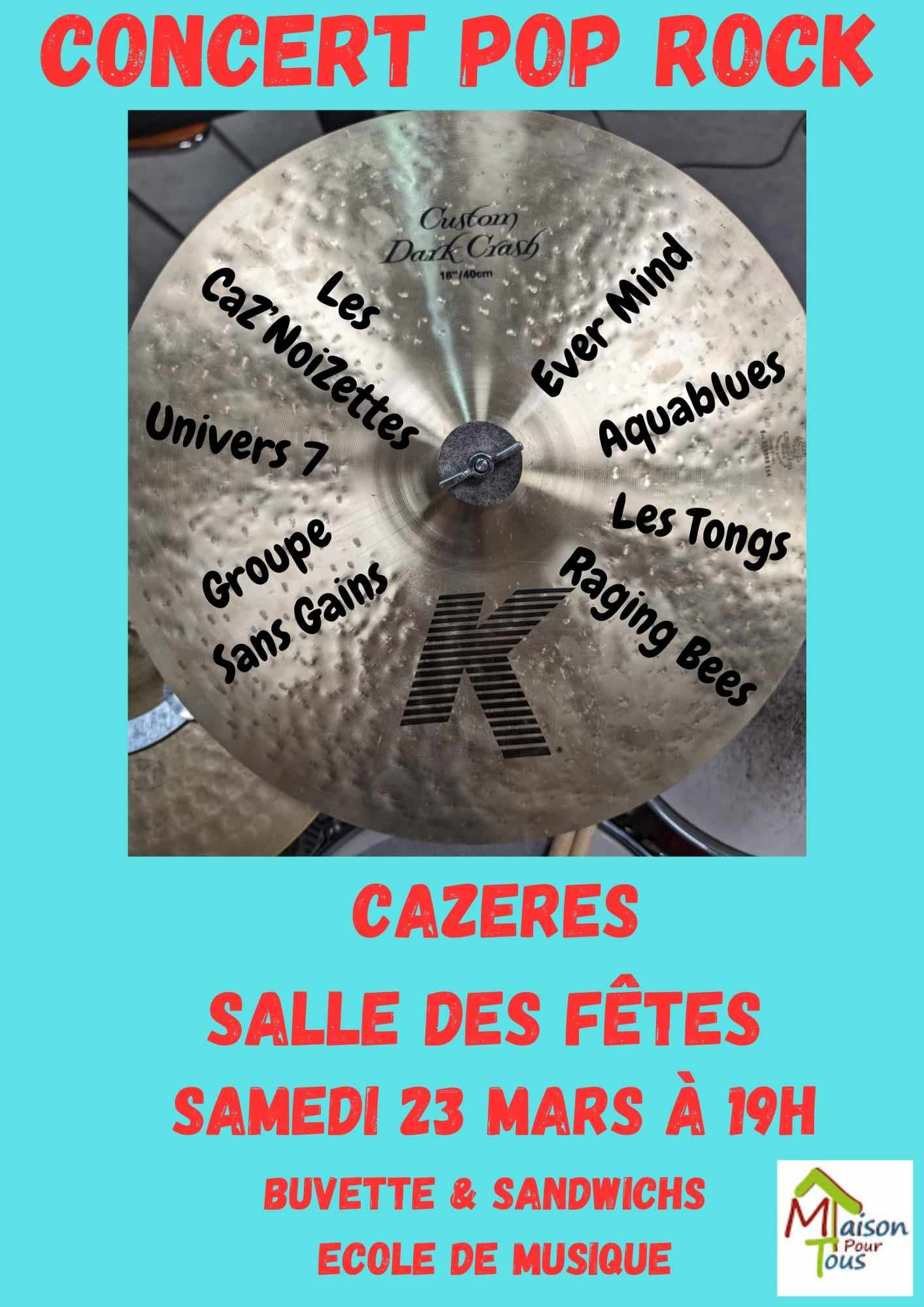 Samedi 23 Mar. 2024 Concert Pop Rock À partir de 19 h 00 Le 23/03/2024 gratuit Salle des Fêtes Michel Bon Buvette & sandwichs