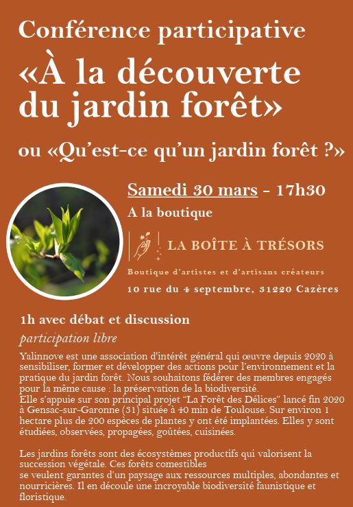 Samedi 30 Mar. 2024 A la découverte du Jardin Forêt À partir de 17 h 30 Le 30/03/2024 participation libre A la boutique "La Boîte à Trésors" Conférence participative