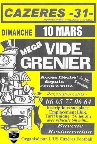 Dimanche 10 Mar. 2024 Méga Vide grenier du Foot À partir de 8 h 00 Le 10/03/2024 5 € les 3 mètres Maoupéou Emplacement libre