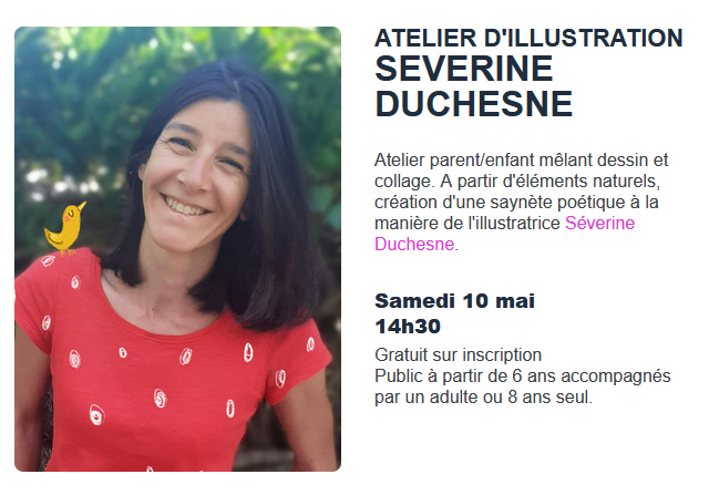 Samedi 10 Mai 2025 Atelier d’illustration avec Séverine DUCHESNE À partir de 14h30 Le 10/05/2025 GRATUIT Médiathèque sur inscription