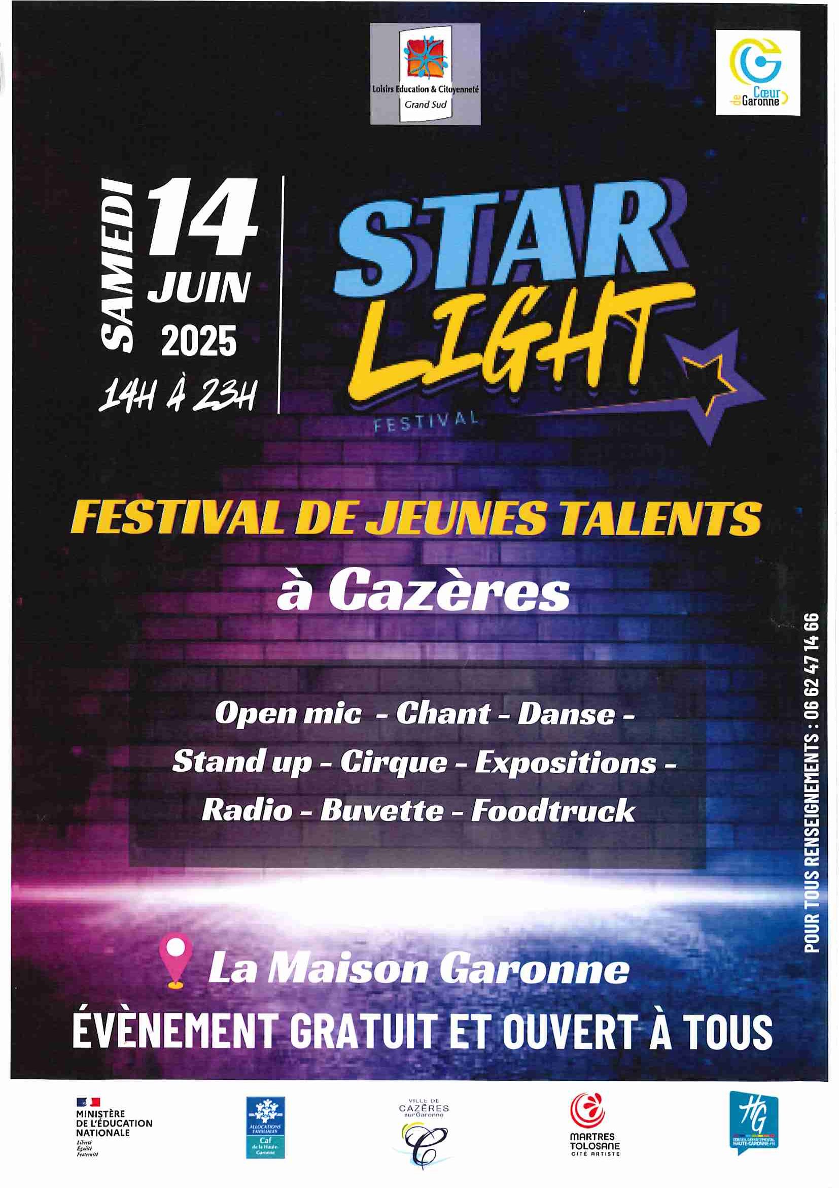 Samedi 14 Juin 2025 Star Light Festival de jeunes talents De 14h à 23h Le 14/06/2025 GRATUIT ouvert à tous Maison Garonne