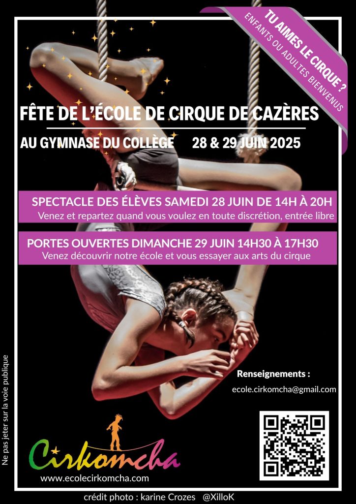 Samedi 28 Juin 2025 Fête de l’école de cirque Cirkomcha À partir de 14h Du 28/06/2025 au 29/06/2025 GRATUIT Gymnase du Collège
