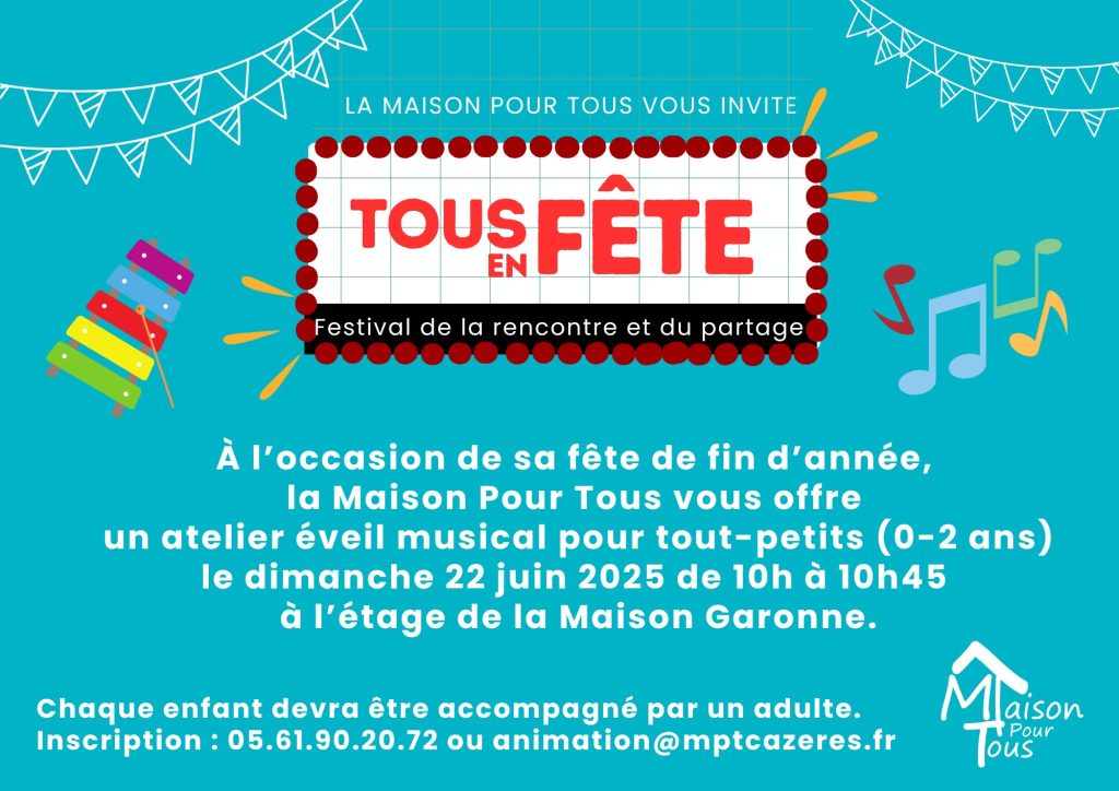 Dimanche 22 Juin 2025 Tous en fête ! atelier éveil musical gratuit pour tout-petits (0-2 ans) De 10h à 10h45 Le 22/06/2025 GRATUIT Maison Garonne