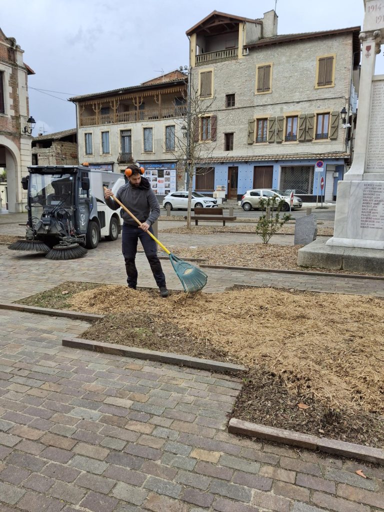 Le broyat provenant de la taille des arbres a été ensuite déposé aux pieds des massifs fleuris et des haies notamment au Parc du Ramier, à Malaret, et sur parvis de la Mairie.